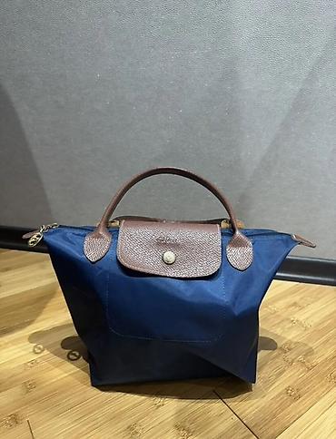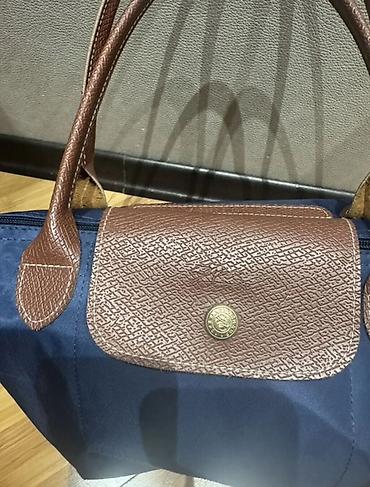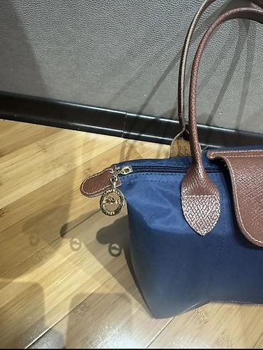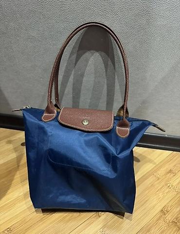 Neylon əl çantası – tünd göy rəngdə, qəhvəyi dəri detallar ilə