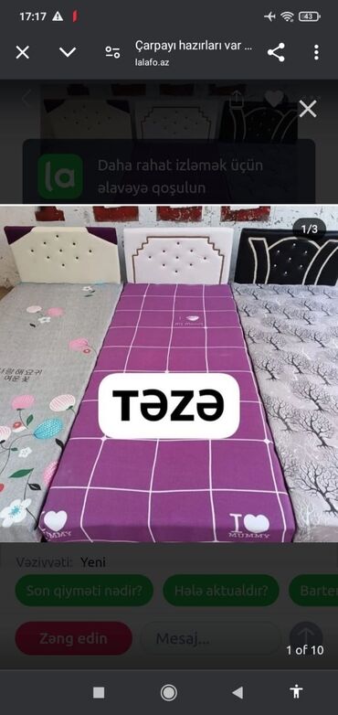 Çarpayı Təzə hazırları var Çatdırılma var Bir nəfərlik 60 manat İki nəfərlik 110 manat Sex malıdı zamanət verilir Vopçat var yaza bilərsiz