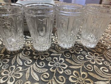 - 4 ədəd klassik naxışlı kristal su/şirə stəkanı: qalın divarlı, relyefli geometrik ornamentlər, hündür silindrik forma, altlıq hissəsi möhkəm kəsimlidir. Gündəlik süfrə və ya qonaqlıq üçün uyğundur.