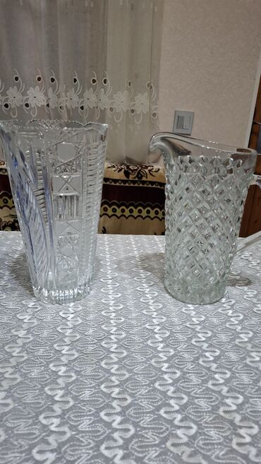 Kristal/qalın şüşə süfrə dəsti – 2 ədəd - 1 ədəd dekorativ kristal vaza: hündür, konusvari forma, üstü dalğalı kənarlı, klassik oyma naxışlı panellər (xətlər, ulduz və geometrik motivlər). Güllər,...