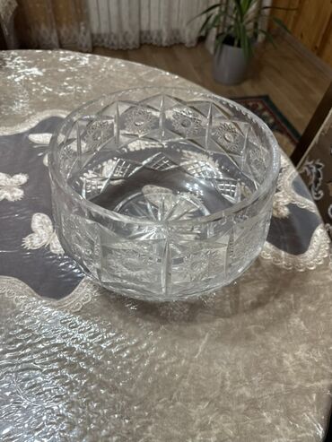 Bu, unikal naxışlı, şəffaf şüşədən hazırlanmış, dairəvi formada olan bir qabdır. Qabın kənarları qabarıq və kəskin kəsiklərlə bəzədilmişdir, bu da ona parlaq və cəlbedici görünüş verir. Mərkəzi his...