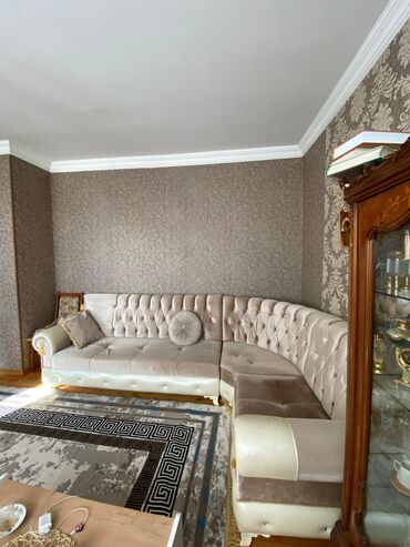Künc divan dəsti + puf Azərbaycan - Dizayn: L formalı künc divan, klassik-modern üslub. Eyni materialdan hazırlanmış dairəvi pufla komplekt. - Rəng/material: Bej rəngli yumşaq parça/velur tekstura...