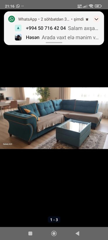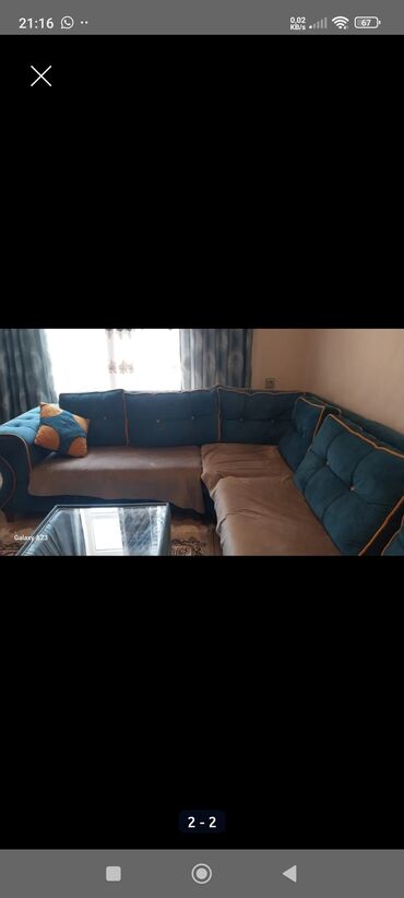 - Komplekt: L formalı künc divan, uyğun puf/oturacaq-çaydankənar masa (üstü şüşəli), 2 ədəd dekorativ yastıq