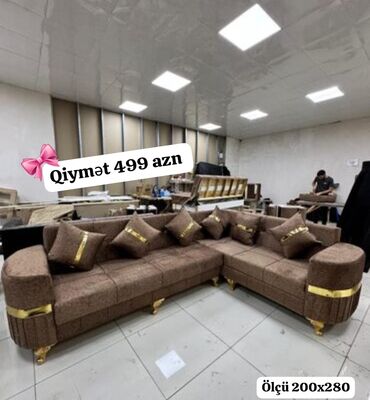 L‑şəkilli künc divan - Rəng: reng secimi var - Komplekt: 6 dekorativ yastıq (qızılı lentli) - Ayaqlar: metal, qızılı rəng - Oturacaq: geniş və dərin, bərkimli süngər qatları - Qollar: enli, yumru ...