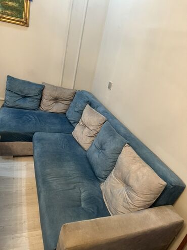 Künc divan dəsti - Forma: L-şəkilli, geniş oturacaq sahəsi ilə - Rəng: Tünd mavi korpus - Üst material: Yumşaq parça - Yastıqlar: Çıxarılan çoxsaylı iri bel yastıqları, çiçək naxışlı örtüklə - Otu...