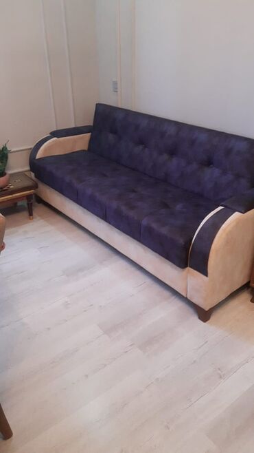 - Rənglər: Mavi-göy və bej kombinasiyalı künc divan; tünd bənövşəyi/indiqo oturacaq‑arxa və bej yanlı düz divan