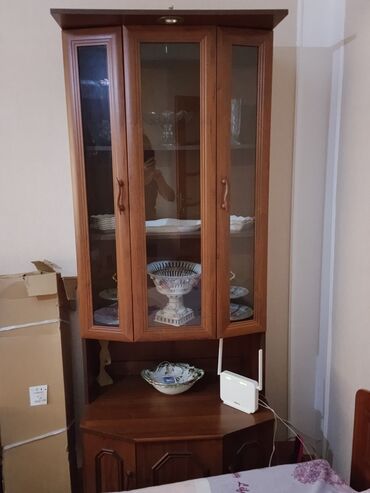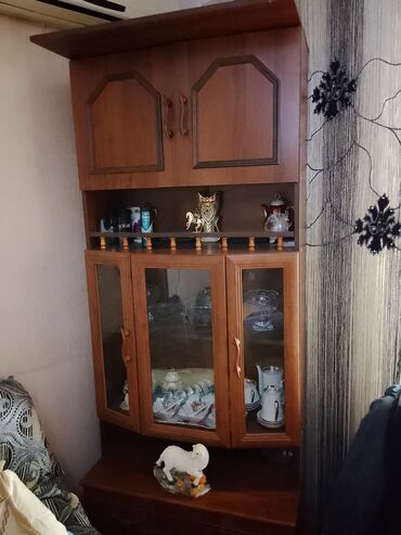 - Daxili quruluş: vitrin hissəsində bir neçə şüşə rəf – qab-qacaq, fincan dəsti, bəzək əşyaları üçün; aşağı hissədə qapılı bağlanan saxlama bölməsi
