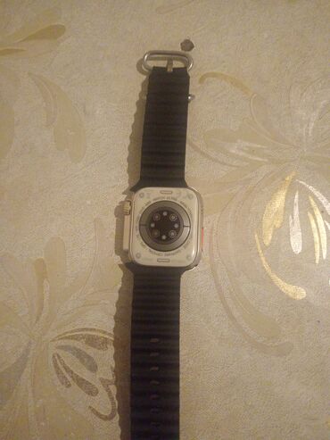 Smart saat – kvadrat ekranlı, metal korpuslu, sağ tərəfdə fırlanan tac və fiziki düymə. Qara rəngli dalğalı silikon qayış, tənzimlənən dəliklər və metal tokalı bağlama. Arxa paneldə optik sensor modulu və maqnitli şarj kontaktları görünür. Korpusun arxasında “Watch Ultra”, “Sapphire Crystal”, “GPS”, “WR 100M” kimi işarələr yer alır.