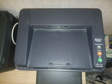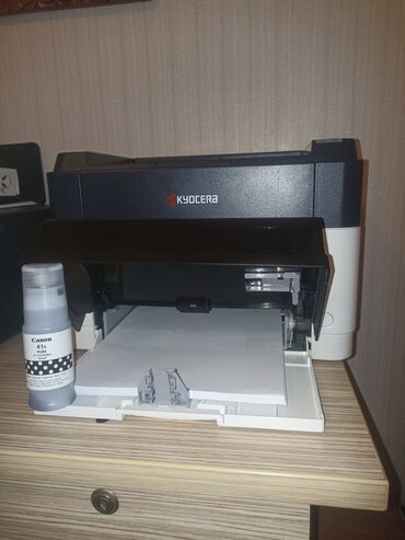 Şəkillərdə kağız tepsisi, üst çıxış bölməsi və idarəetmə paneli görünür. Yanında göstərilən butulka çap üçün toner deyil; cihaz Kyocera lazer toneri ilə işləyir. Ofis və ev üçün sürətli sənəd çapına uyğundur.