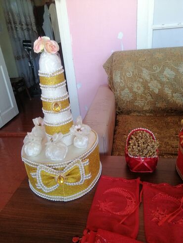 Dəst əl istehsalıdır və eyni rəng palitrasında koordinasiya olunub.. Xınayaxdı,nişan,qız toyu və mərasimlər üçün dekor kimi istifadə oluna bilər..