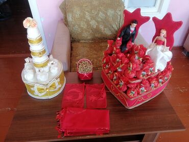 -Böyük ürək formalı xonça: üstündə gəlin-bəy fiqurları,kənarları qızılı bəzək və muncuqlarla işlənib..İçində xına/souvenir üçün çoxsaylı qırmızı kisəciklər..