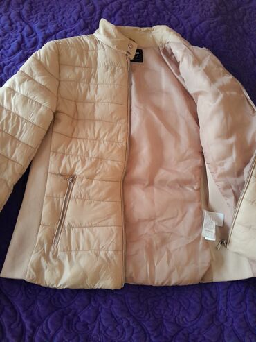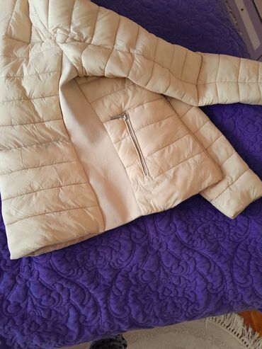 Bej rəngli, qısa model qadın gödəkçəsi. Bu gödəkçə soyuq havalar üçün