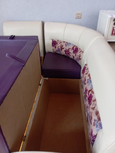 - Rəng: krem korpus + bənövşəyi oturacaqlar, çiçək naxışlı dekorativ arxa yastıqlar