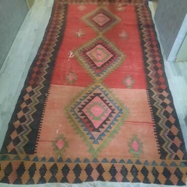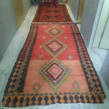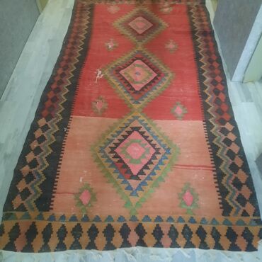Ölçüləri 3×50 1×70. Qədim üslubda əl toxuması kilim - Növ: Kilim (ikiüzlü, xovsuz toxunuş) - Material: Təbii yun iplik - Rəng palitrası: parlaq qırmızı fon, lacivərdi/göy, yaşıl, qara və narıncı ...