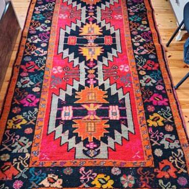 Qədim üslublu əl toxuması xalça - Ölçü: 2,60 × 1,30 m (şəkildə göstərilib) - Rəng palitrası: parlaq qırmızı fon, tünd-yaşıl, krem, mavi və sarı tonlarda naxışlar - Naxış: mərkəzdən axan bitki-moti...