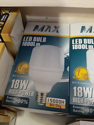 - MAX LED Bulb – 18W High-Power, 1800 lm parlaqlıq. Qutuda: “Bir il zəmanət”, “Energy Saving 90%”, resurs: 15000 saat (gündə 8 saat).