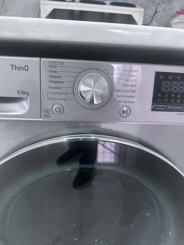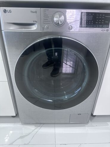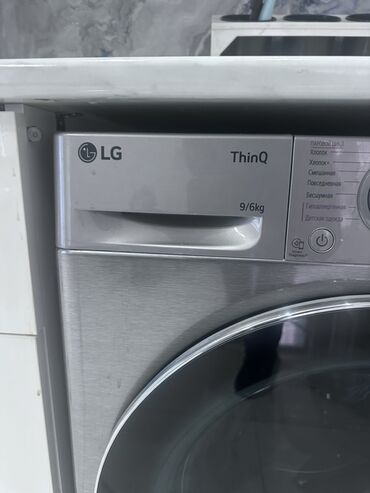 LG ThinQ paltaryuyan-quruducu maşın – ön yükləməli, paslanmayan polad gövdə. Paneldə “LG ThinQ”, “Direct Drive” və “9/6 kg” qeyd olunub: 9 kq yuma, 6 kq qurutma tutumu.