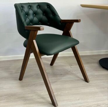- Retro komfort kreslo: Tünd yaşıl, düyməli (kapitone) arxa hissə və yumşaq oturacaq. Bərk ağac gövdə və bucaqlı ayaqlar klassik-modern görünüş verir, qol dayaqları əlavə rahatlıq yaradır. Yemək otağı, iş küncü və ya gözləmə zonaları üçün uyğundur.