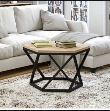 - Altıbucaqlı kofe masası: Açıq taxta üstlük və qara metal geometrik ayaq. Stabil konstruksiya, geniş səth; kitab, fincan və aksesuarlar üçün idealdır. Müasir, minimalist interyerlərlə harmoniyalıdır.