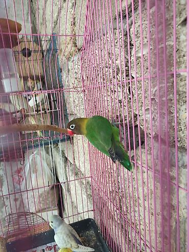 - Digər fotoda çəhrayı rəngli barlı ikinci qəfəsdə əlavə lovebird və altlıqda yem qabı görünür.