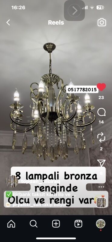 - 12 lampalı, bronza rəngində klassik çilçıraq. Qolları dekorativ relyefli, sarkıt kristal bəzəklərlə. Tavana zəncirli asma, E14 tipli şam formalı lampalara uyğun. Yazıda “ölçu və rengi var” qeyd olunub.