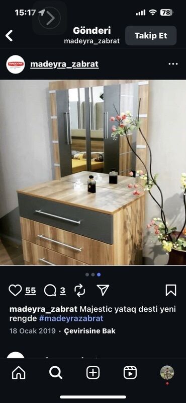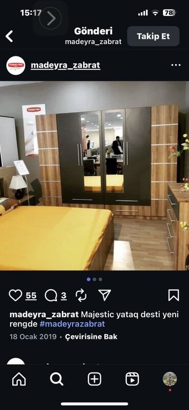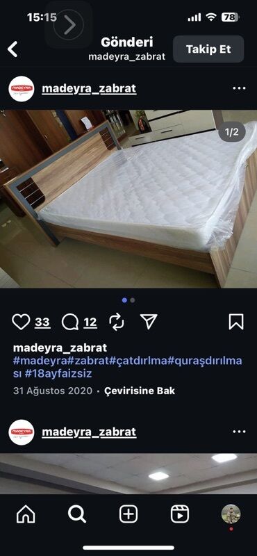- Çarpayı: ağac teksturalı karkas, tünd boz metal detallı başlıq; üstündə ortopedik döşək göstərilir.