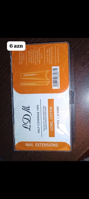 - LDM yarım örtüklü dırnaq tipləri – Long Coffin: 504 ədəd, 12 ölçü. Qutulu. “Nail Extensions”. Qiymət: 6 AZN (şəkildə göstərilib).