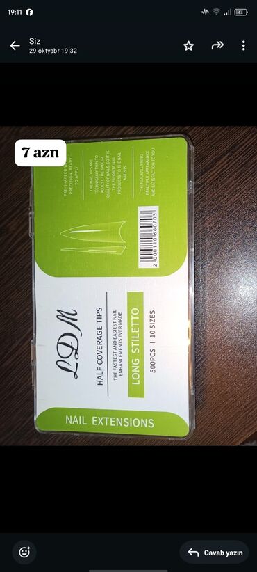 - LDM yarım örtüklü dırnaq tipləri – Long Stiletto: 500 ədəd, 10 ölçü. Qutulu. “Nail Extensions”. Qiymət: 7 AZN (şəkildə göstərilib).
