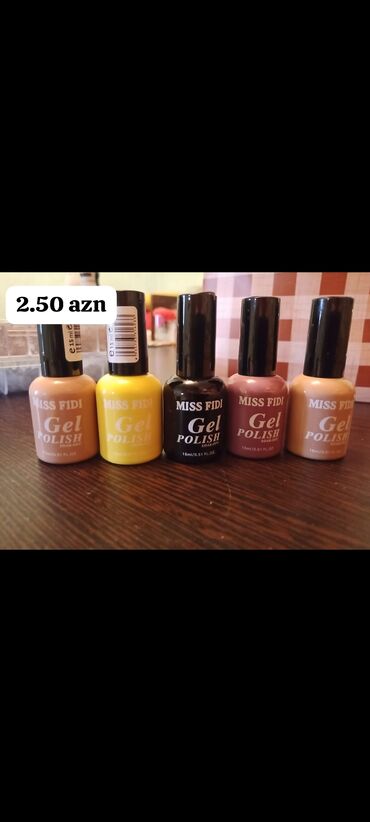 - Miss Fidi Gel Polish lakları: 15 ml (0.51 fl.oz). Müxtəlif rənglər. Qiymət: 2.50 AZN (şəkildə göstərilib).
