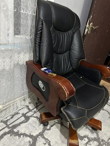 - Material: qara rəngdə dəri/eko-dəri oturacaq və bel hissəsi, ağac qoltuqaltılar və baza