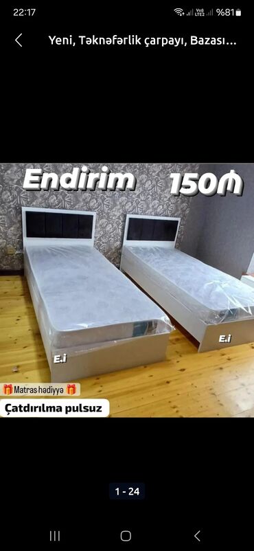 Yeni, Təknəfərlik çarpayı, Bazasız, Matras ilə, Siyirməsiz
