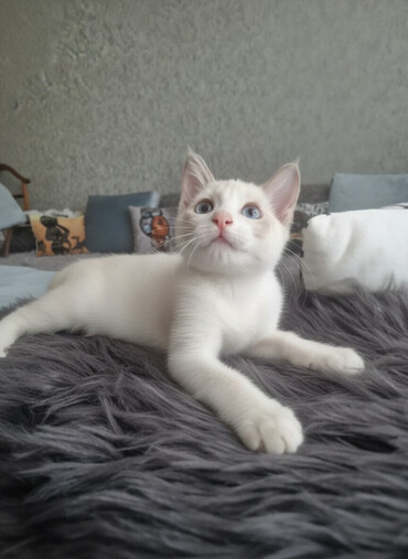 Şirin, uzun tüklü pişik – Siam/Birman tipində rəngarəng “color-point” görünüşlü. - Xəz: krem-açıq bədən, tünd qulaqlar, pəncələr və üz maskası; yumşaq, sıx və uzun quyruqlu. - Gözlər: mavi tonlarda...