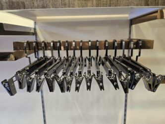 - Quruluş: üst hissədə rels/şina üzərində asma üçün kancalı sistem; alt hissədə uyğun rəngli metal şalvar-beldə saxlayıcı bölmələr