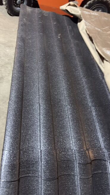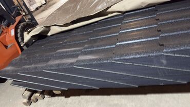 Metall kirəmit formalı dam örtüyü panelləri - Material: profil metall (kirəmit naxışlı) - Rəng: tünd (qara/qaranlıq boz ton) - Forma: dalğalı/kirəmit tipli panellər, bir-birinə üst-üstə oturan kən...