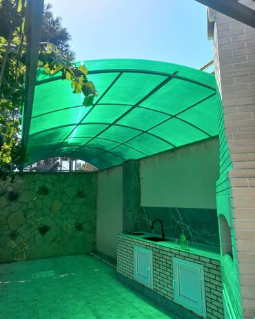 Layihələr şəkillərdə: divara bitişik polikarbonat örtüklər, tağvari yaşıl polikarbonatlı yay mətbəxi, geniş sahə üçün çoxdayaqlı karkaslı çardak. Sifarişə uyğun ölçü, forma və rəng seçimi mümkündür.