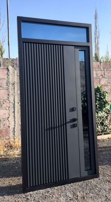 - Müasir qapı – şaquli lamelli panel, mat qara tekstura, yan və üst şüşə işıqlıqla.