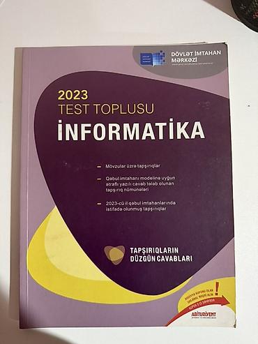 Təcilli satılır Məhsul: “İnformatika – 2023 Test Toplusu” (Dövlət İmtahan Mərkəzi) Xüsusiyyətlər: - Mövzular üzrə tapşırıqlar və izahlı nümunələr - Qəbul imtahanı modelinə uyğun, ətraflı yazılı c...