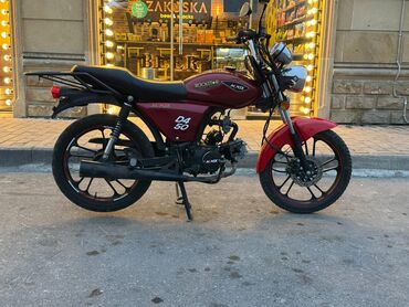 Minsk D4 50 motosiklet - Mühərrik: 50cc, karbüratorlu, benzinli - Transmissiya: mexaniki (sürətlər əl ilə) - Rəng: qara, dekorativ stikerlər - Ön işıqlandırma: dairəvi LED projektor tipli far (mav...