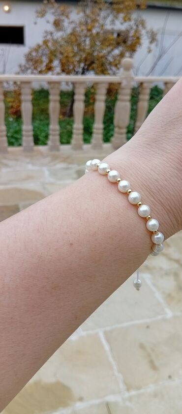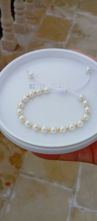 - Material: parlaq sintetik mirvari muncuqlar, qızılı rəngli metal ara hissələr, ağ rəngli möhkəm ipləmə