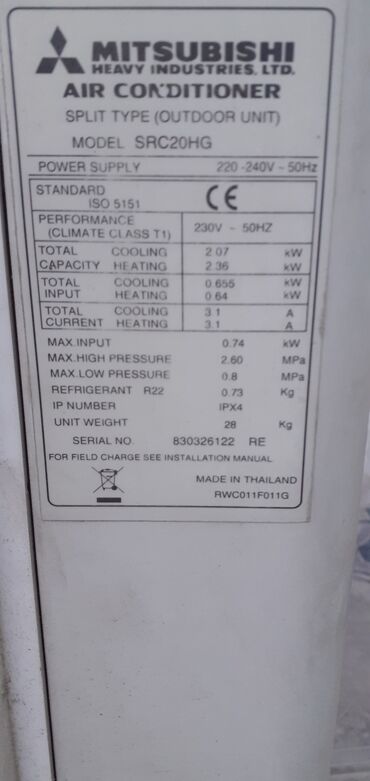 Mitsubishi Heavy Industries split kondisioner üçün çöl bloku Model: SRK20HG (etiketdə göstərilib) Tip: Split tipli (outdoor unit) Brend: Mitsubishi Heavy Industries, Ltd. Mənşə: Thailand Texniki ...