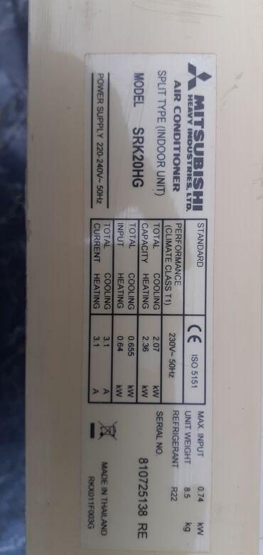 Mitsubishi Heavy Industries split kondisioner dəsti Model: - Daxili blok: SRK20HG - Xarici blok: SRC20HG Texniki göstəricilər (etiket üzərindən): - Enerji təchizatı: 220–240V, 50Hz - Soyutma gücü...