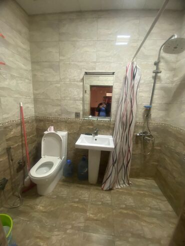 - Sanitar qovşaq: birgə vanna/hamam, duş sistemi (üst duş başlığı), pərdə, unitaz, əl‑üz yuyan pedestal, kafel‑metlax tam.