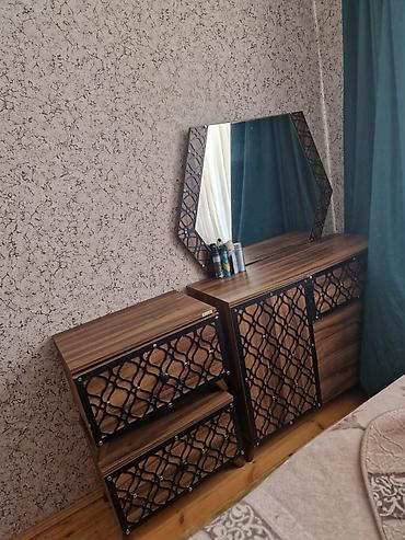 - Komod və güzgü: komodda çekmecə və qapılı bölmə, üstündə çoxguşəli forma güzgü; ön panellər dolab və tumbadakı ilə eyni dizayn.