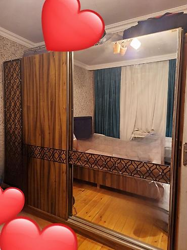 - Geniş sürgülü qapılı dolab: bir qapı tam güzgülü, digəri və dekor zolaqları qara naxışlı panel ilə. İç quruluşu asma bölmə, rəflər və geyim üçün əlverişli sahələrlə.