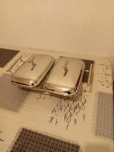 - İsti yemək təqdimat qabı (chafing dish) – iki bölməli: Hər bölmə üçün ayrıca paslanmayan polad qapaq, şüşə iç qablar və daşıma üçün tutacaqlar. Bufet, süfrə və tədbirlərdə yeməklərin isti saxlanması və servis üçün idealdır.