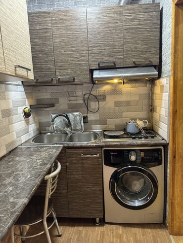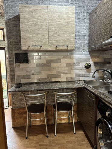 Kompakt sahələr üçün ideal planlama: iş zonası, yuma və bişirmə zonaları, eləcə də bar tipli nahar yeri bir xəttdə yerləşdirilib. Dizayn həm müasir, həm də praktik saxlanmanı təmin edir.