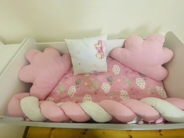 - Beşiyin içi üçün yumşaq bərkitmələr: bulud formalı yastıqlar, hörük tipli qoruyucu bort, naxışlı çarşaf və kiçik dekorativ yastıq