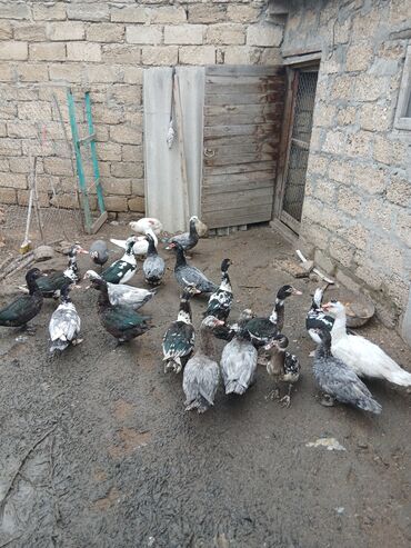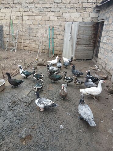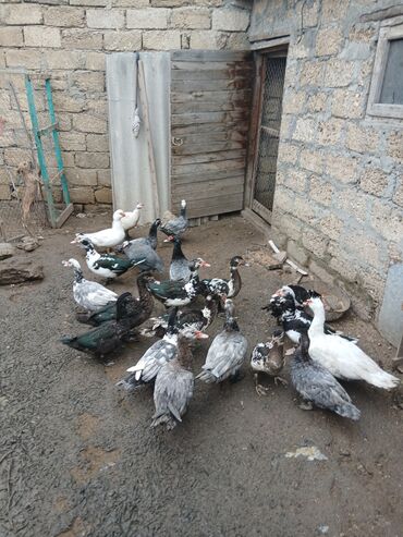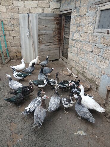 Muscovy (hinduşka ördəyi) ördəkləri – qarışıq rəngli (qara-yaşıl parıltılı lələklər, ağ ləkələr, qırmızı üz nahiyəsi) fərdlər. Şəkillərdə həm erkək, həm də dişi quşlar görünür. Sakit xasiyyətli, sə...
