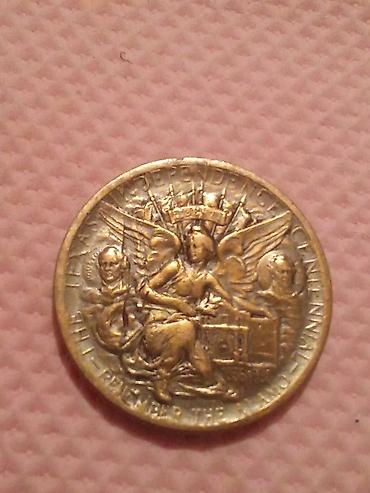 - Latın yazılı xatirə/medal tipli parça: mərkəzdə qanadlı fiqur, ətrafda “THE INDEPENDENCE CENTENNIAL – REMEMBER THE ALAMO” məzmunlu yazılar və büstlər.