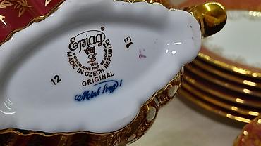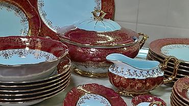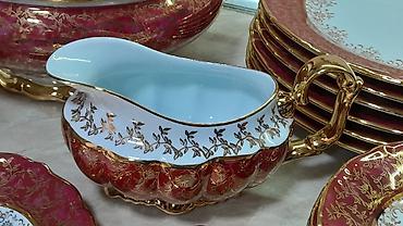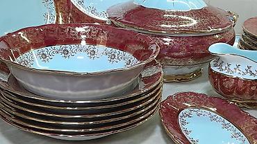 Zərif naxışlı və bəzək daşları ilə işlənmiş porselen süfrə-servis dəsti. Xüsusiyyətlər: - Rəng: ağ, gümüşü xətt və ornamentlərlə, parlaq dekorativ daşlarla - Material: incə porselen - Dizayn: dalğ...